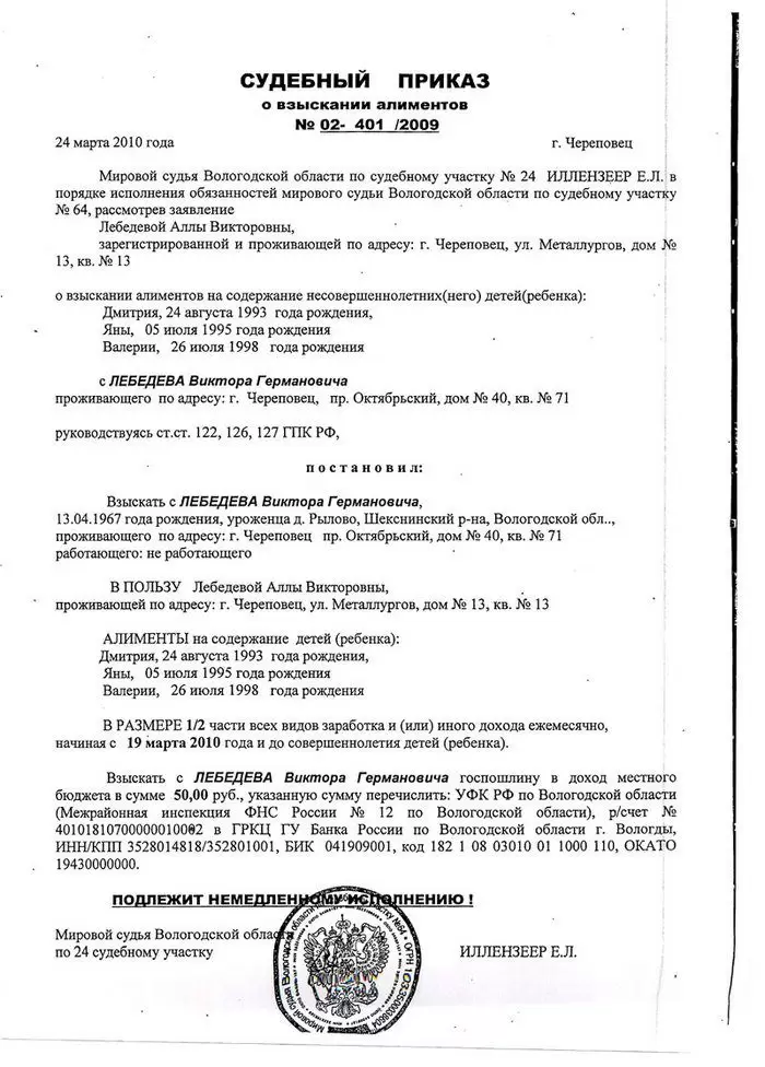 Судебный приказ на алименты