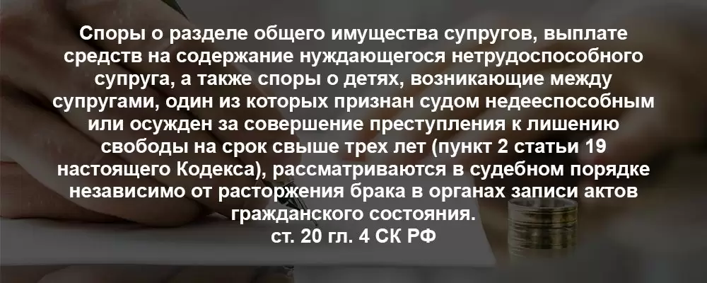 Процедура бракоразводного процесса без отягчающих обстоятельств (с разделом имущества ценностью до 50 000 рублей) проходит в мировом суде. Регулируется этот процесс статьей 22 СК РФ. Если у женщины есть основания препятствовать разводу, основываясь на беременности, а также первый год после рождения ребенка — нельзя получить развод без согласия жены ст. 17 СК РФ. Даже такой неприятный нюанс, как смерть ребенка во время родов не дает возможность развестись в первый год, так как формально роды состоялись. В случае наличия отягчающих обстоятельств (имущество ценностью более 50000 рублей или несовершеннолетние дети) с запросом на развод обращаются в суд общей юрисдикции. Немаловажный момент, когда муж и жена живут отдельно, заявление в суд подается по адресу ответчика.